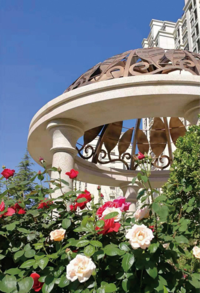 走進(jìn)這個(gè)養(yǎng)護(hù)中心,雖然都是些耄耋高齡、甚至還有很多坐輪椅的老人,卻絲毫感覺不到凄涼、壓抑和暮氣沉沉。這里的樓房建筑的與普通小區(qū)并無兩樣,綠地率達(dá)60%,樓旁路邊種有杏、石榴、山楂等果樹。高大的楊樹榆樹與隨處可見的冬青灌木錯(cuò)落有致,比人還高的月季將園區(qū)裝點(diǎn)得姹紫嫣紅。造型、顏色各異的亭子散落其中,影影綽綽。